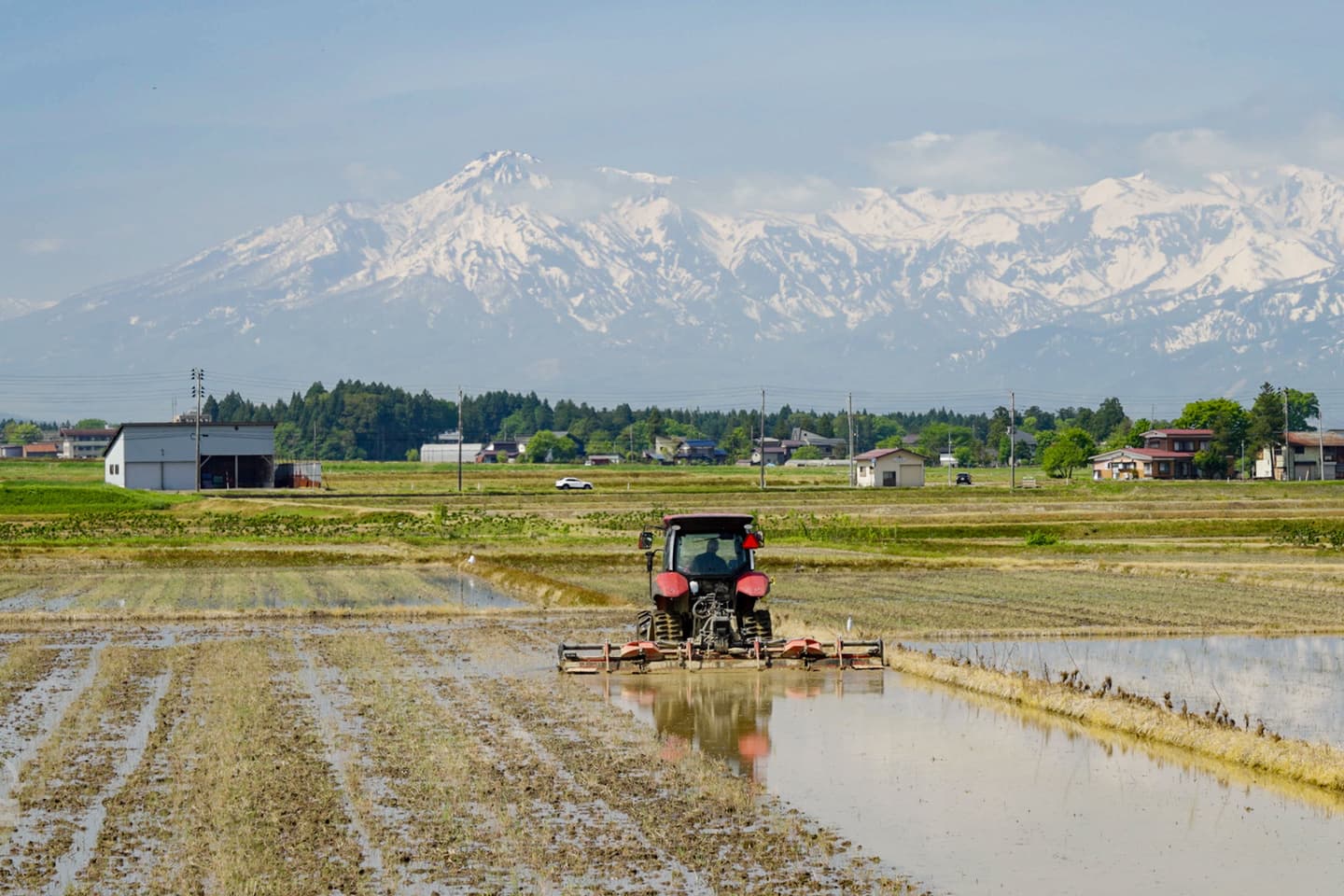 田おこしの終わった田んぼに水を入れ、さらにトラクターで土をこまかくしながら水平に均していきます。
