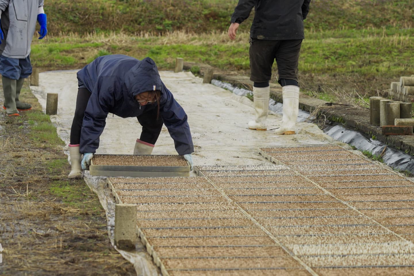 専用のトレーに種もみのベッドとなる土を敷き、水を与え、あらかじめ下処理をした種もみをまんべんなく敷き詰めます。さらに専用の土を上からかぶせていきます。