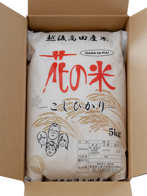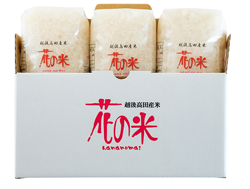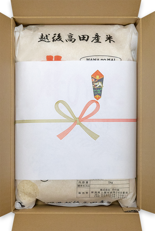 3合×3袋と3kg、切り餅5枚入りは花の米オリジナル包装紙にてラッピングいたします。