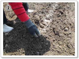 穴を掘りましたら、先に「かにの力」を適量に巻まいていきます。全てが天然素材なので、多少多めにまいても畑に害はありません。