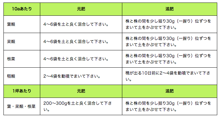肥料の使用例 ※種まき、定植の2週間位前にまくと効果があらわれます。