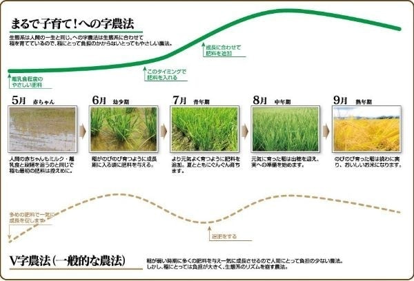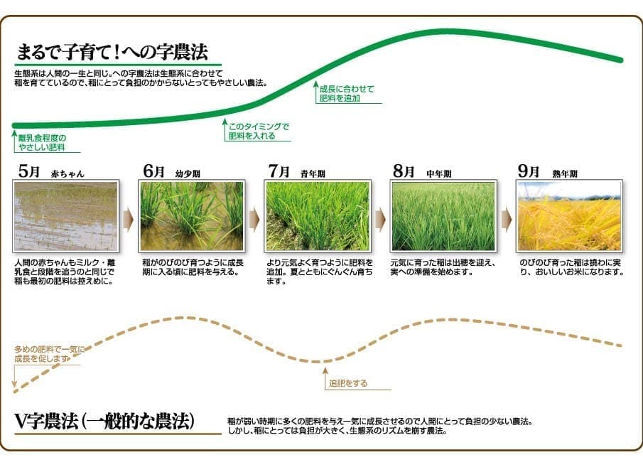 対して私たちが採用している「への字農法」はとても手間ひまのかかる方法ですが、稲が本来持っている成長曲線に合わせて肥料を与えて稲が成長したい時にそれを助けてあげる育て方なので、稲に余計な負担をかけずストレスなく元気で丈夫に育ち、おいしいお米が穫れるようになります。ある意味人間の子育てに近いかもしれませんね。