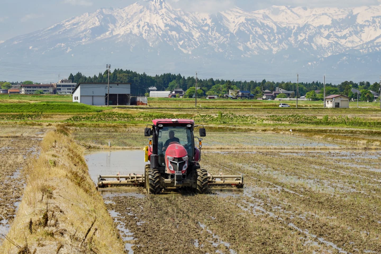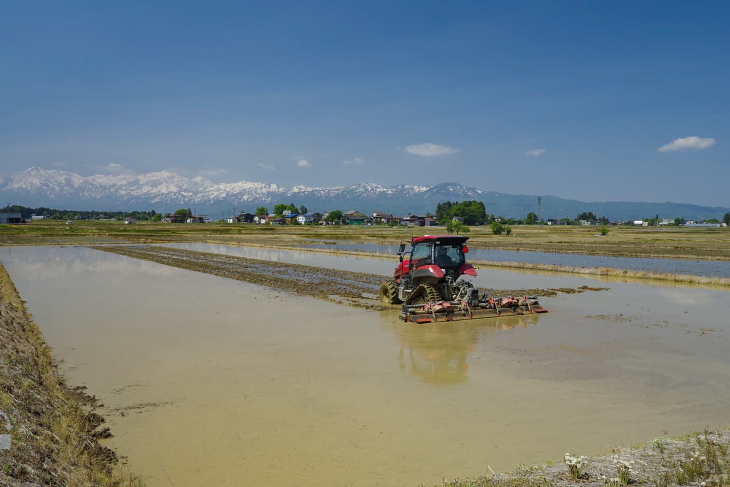 田おこしの終わった田んぼに水を入れ、さらにトラクターで土をこまかくしながら水平に均していきます。