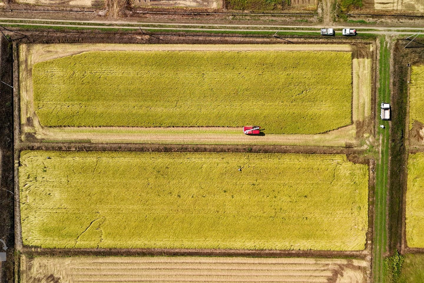 花の米では、一枚の田んぼでトラクターをゆっくり3回走らせ、1度目より2度目、2度目より3度目といったかたちで